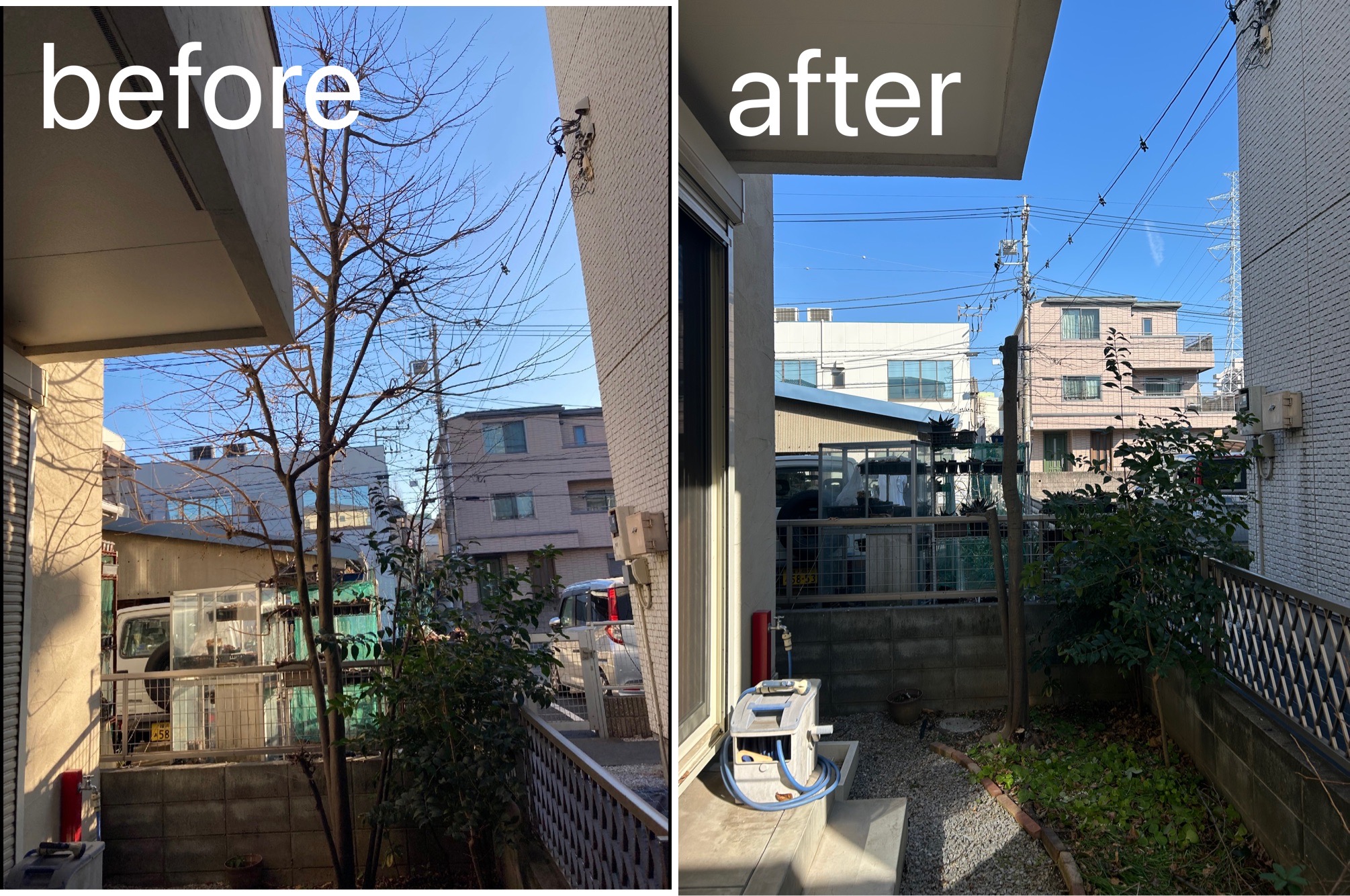 建物と建物の間にある木の枝を大きく整理し、約半分の高さへ切り下げました🌱